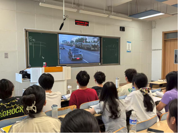 在观看过程中,师生们认真聆听重要讲话,深刻领会抗日战争胜利的重大历史意义与深远时代价值。当阅兵式环节展开,看着屏幕上整齐划一的受阅方阵迈着铿锵步伐通过天安门广场,各类先进武器装备依次亮相,现场师生的自豪之情油然而生,掌声与赞叹声此起彼伏。大家纷纷表示,从受阅队伍的精神风貌中看到了人民军队的威武强大,从先进装备中感受到了国家的综合实力,更从历史与现实的交汇中读懂了“落后就要挨打,自强才能自立”的深刻道理。