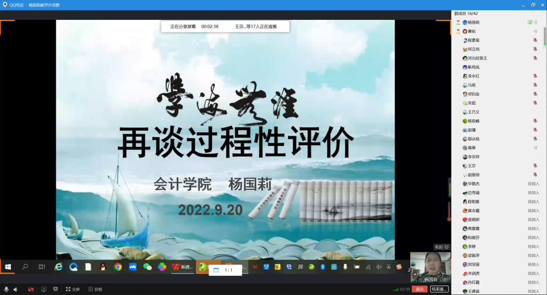 2022年9月20日下午,由教学评估与教师教学发展中心主办,bg大游官方网站承办的本学期第一期教学沙龙活动在线上顺利开展。bg大游官方网站杨国莉教授主讲的教学沙龙主题是“再谈过程性评价”。来自bg大游官方网站、数统公司、信息技术公司的50多名教师参加了本次活动。