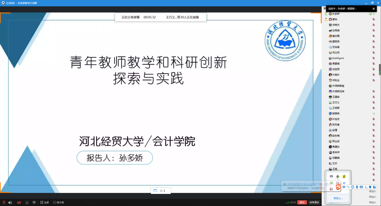 2022年10月17日下午,由教学评估与教师教学发展中心主办,bg大游官方网站承办的教学沙龙活动,在线上顺利开展。bg大游官方网站孙多娇副教授的教学沙龙主题是“青年教师教学和科研创新探索与实践”。来自bg大游官方网站、金融公司、马克思主义公司、外语教学部等30多名教师参加了教学沙龙,活动由杨国莉副经理主持。