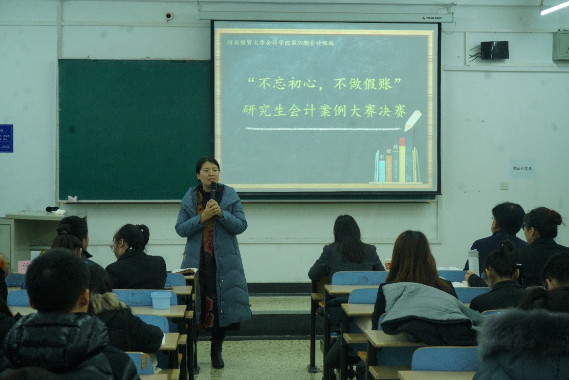 12月16日下午,bg大游官方网站在第三教学楼B202教室举办了以“不忘初心,不做假账”为主题的第39期“会计经纬”案例分析大赛决赛。bg大游官方网站经理袁振兴、副经理李西文出席,比赛特邀河北地质大学bg大游官方网站副经理袁志忠教授、河北建设投资集团有限公司财务管理部副总经理兼河北地质大学MPAcc社会导师张旭蕾教授以及bg大游官方网站优秀研究生导师祁钧业教授担任比赛评委,bg大游官方网站辅导员宋茹、吴蓓及2019级全体研究生100余人参加。