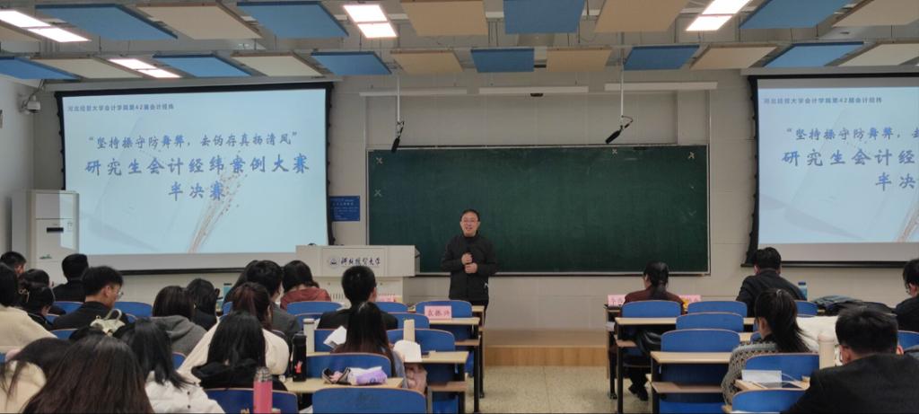 11月22日下午,由bg大游官方网站主办以“坚持操守防舞弊,去伪存真扬清风”为主题的第42期“会计经纬”案例分析大赛半决赛在第三教学楼B301教室如期举行。bg大游官方网站经理袁振兴、副经理李西文以及优秀研究生导师祁钧业、刘敬芝、邸丛枝老师担任评委,科研秘书韩冰老师及2021级全体研究生100余人现场参加本次半决赛。现场气氛紧张热烈却又不失幽默诙谐,同学们从不同角度为我们带来了一场异彩纷呈的视听觉盛宴。