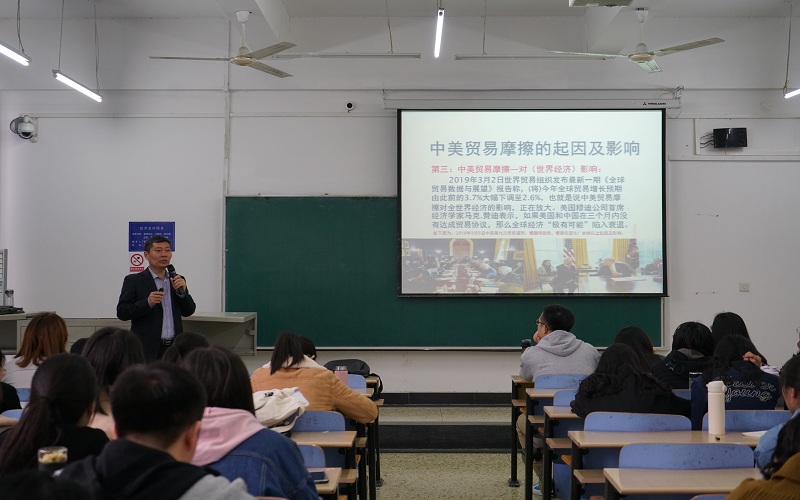 4月13日下午,bg大游官方网站在第三教学楼B202教室举办“中美贸易摩擦的起因及影响”专题讲座。石家庄水务集团财务处处长、河北地质大学研究生社会导师、正高级会计师陈永伟应邀主讲,公司2018级研究生参加。