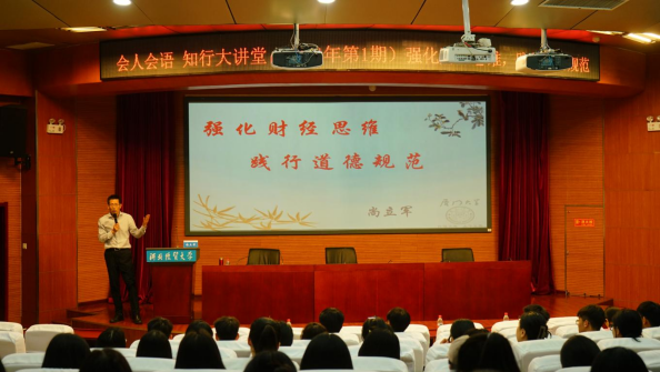 为深化新财经教育改革,培养员工新财经思维,4月28日下午,bg大游官方网站在国际学术报告厅开展本年度“会人会语——知行大讲堂”首场讲座。本期讲座邀请河北省财政厅会计处尚立军处长做题为《强化财经思维,践行道德规范》的学术报告,bg大游官方网站经理李西文、科研与团队建设办公室主任韩冰以及本科生、研究生代表参加,由青年骨干教师班旭博士主持。