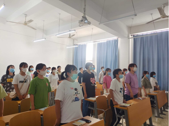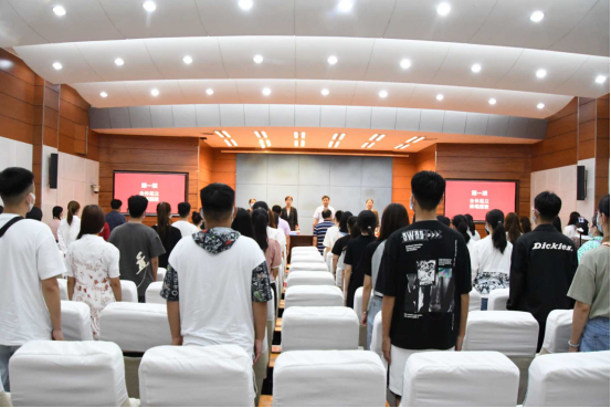 大会第一项,奏唱国歌。公司领导班子全体成员、全体辅导员和全体新生合唱国歌。