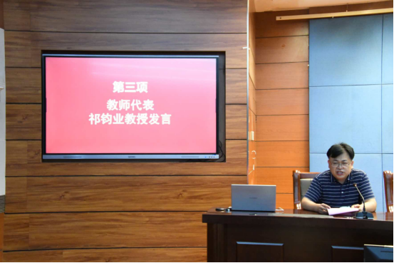 大会第三项,教师代表祁钧业教授发言。祁老师结合案例向同学们分享了人工智能对会计、审计与财务管理行业的影响,帮助同学们明确了今后学习和努力的方向。他希望同学们作为新时代的老员工,应该培养自己良好的学习习惯、奠定扎实的专业基础、拓宽多元化的思考视角,从而提升自我实力,提高与他人竞争的能力。