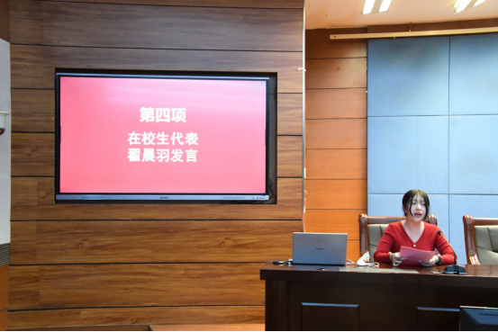 大会第四项,在校生代表翟晨羽发言。她分享一些学习心得与新生共勉,希望能对新生们未来四年的生活有所帮助。第一,心态平和,方可决胜千里;第二,树立目标,方可步步为赢;第三,勇于实践,方可脚踏实地。