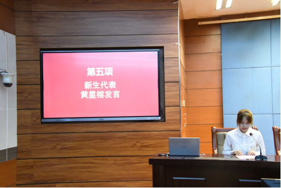 大会第五项,新生代表黄星榕发言。首先,她表达了来到经贸美丽校园后的喜悦心情;其次,她表示作为新生应该秉承校训,激励自己成为更好的人;最后,她承诺作为新时代的青年,要明白少年强则国强的道理,要学知识长本领,努力为祖国奉献青春力量。
