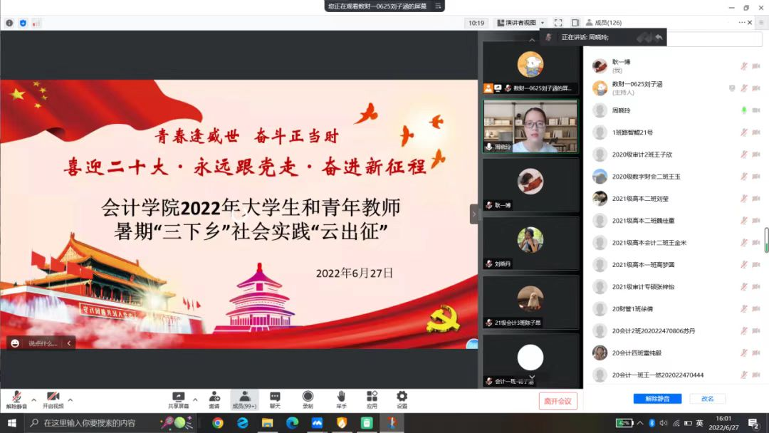 6月27日下午,bg大游官方网站2022年暑期社会实践“云出征”仪式正式启动。院团委书记周晓玲出席,社会实践各小分队成员及团支书共计125名同学参与。