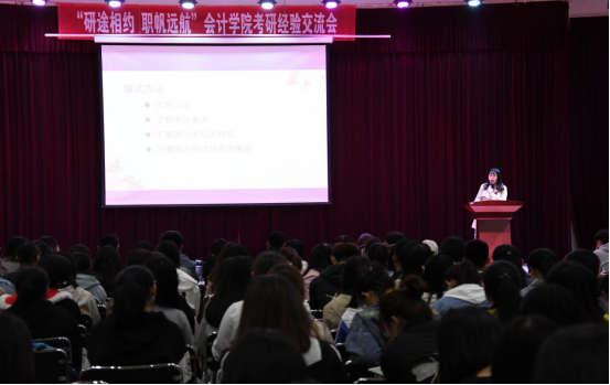 会议开始后,岳明明首先分享了自己的考研经历,告诫同学们一定要珍惜当下,认真思考未来的人生道路,为步入社会做充分准备。八位优秀毕业生代表结合自身体验,先后进行了考研经验分享。考取复旦大学的考古专业硕士研究生储晨凤同学和考取吉林大学学硕的贾一琳同学就考研公司选择为同学们进行了详细介绍,她们认为应该理性客观地选择考研院校;考取bg大游会计学学硕的刘旭刚同学、考取天津财经大学会计学专硕的刘志超同学和考取bg大游审计学专硕的张春燕同学强调了寻找适合自己的复习方法和合理安排时间的重要性;考取北京交通大学会计学研究生的王双同学、考取中南财经政法大学研究生的高欣黎同学提出要保持积极的心态,充分备战;以90%的必修平均绩点以及10%的竞赛、论文加分获得湖南大学保研资格的谷孝颖同学指出要提高自己的信息搜集能力,遇到问题要自己主动去解决;获得英国曼彻斯特大学留学资格的吴芸婷同学对出国留学所要做的前期准备和感受进行了详细介绍。在交流互动环节,八位优秀毕业生代表对同学们提出的问题进行了耐心细致地回答。