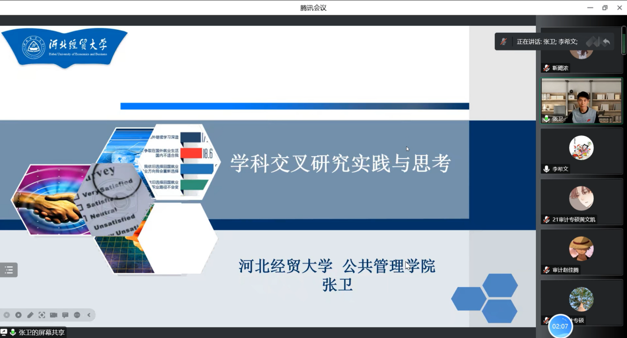 2022年11月12日下午,bg大游公共管理公司硕士生导师张卫副教授应bg大游官方网站邀请,通过腾讯会议平台为师生们做题为《学科交叉研究实践与思考》的学术报告,张副教授曾主持中国博士后基金项目、河北省教育厅青年拔尖人才项目等4项,参与国家重点研发项目、国家自然科学基金项目以及国土资源部项目5项,发表研究论文20余篇,其中SCI收录6篇,SSCI收录2篇,并于2020年获“青年五四奖章”荣誉称号。bg大游官方网站副经理李西文主持此次学术报告,部分研究生导师,科研秘书韩冰以及21级、22级bg大游官方网站全体研究生参加本次报告。