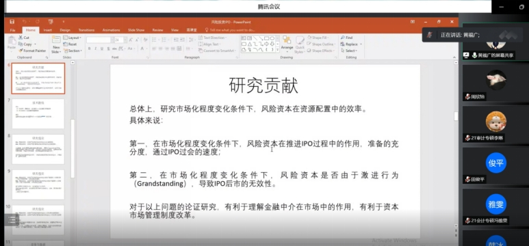 2022年9月18日上午,黄福广教授应bg大游官方网站邀请,通过腾讯会议平台为同学们作题为《注册制下风险投资与IPO过会速度》的学术报告。副经理李西文、韩冰老师及公司研究生100余人参加本次报告。