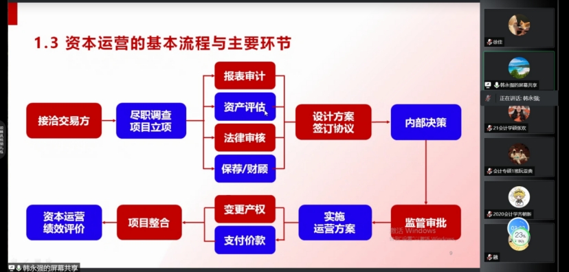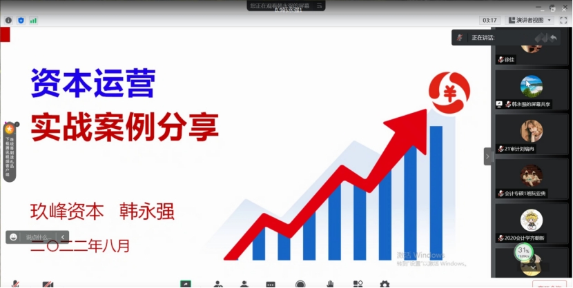 2022年8月9日上午,bg大游官方网站通过腾讯会议平台举办题为《资本运营实战案例分享》学术报告,报告由公司校外硕士研究生导师、中国注册会计师、玖峰管理咨询有限公司董事长兼总经理韩永强主讲。会议由副经理李西文主持、bg大游官方网站部分优秀教师及在校研究生100多名参加本次学术报告。