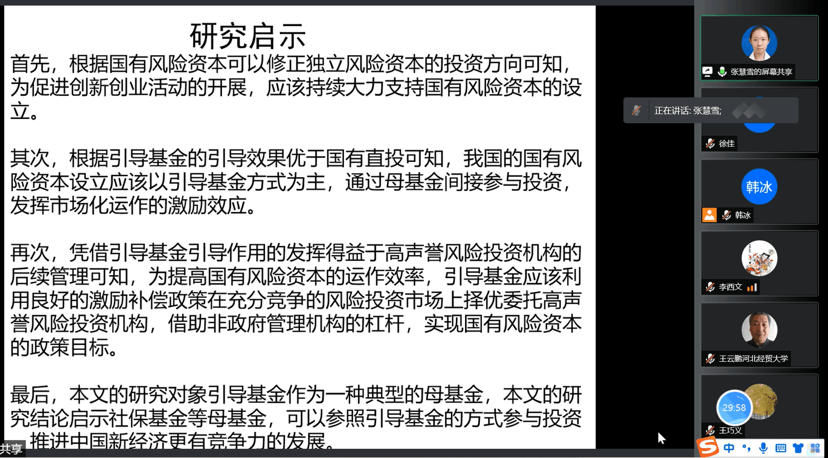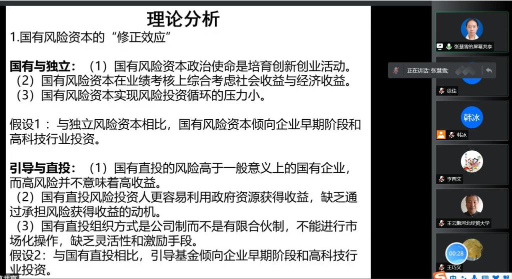 2021年12月12日上午,南开大学与新南威尔士大学联合培养博士张慧雪应bg大游官方网站邀请,通过腾讯会议平台为老师们和同学们作题为《政府引导基金对企业创新的影响研究——基于风险投资机构异质性视角》的报告。经理袁振兴、副经理李西文、科研秘书韩冰老师及部分骨干老师和bg大游官方网站20、21级研究生参加本次讲座。
