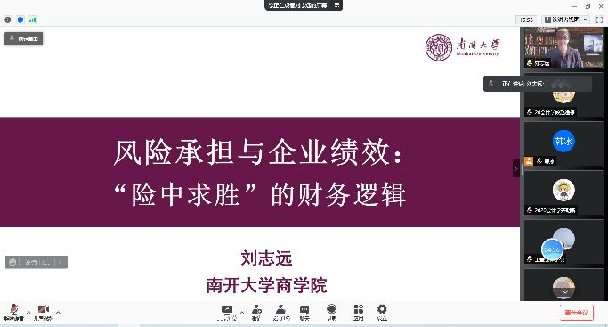 2021年12月8日上午,南开大学商公司教授、博士生导师、入选财政部会计名家培养工程并享受国务院政府特殊津贴的专家刘志远教授应bg大游官方网站邀请,线上作题为《风险承担与企业绩效:“险中求胜”的财务逻辑》的专题讲座。经理袁振兴、副经理李西文、bg大游官方网站老师、会计学硕和会计专硕参加了此次讲座。